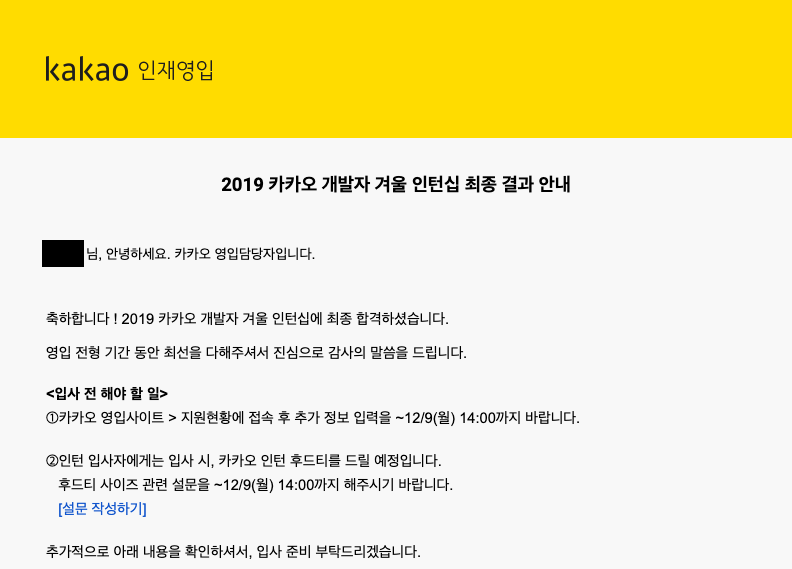 10일 정도 후에 결과 메일이 왔다. 오후 6시가 지나서 오늘은 안 오려나보다 하고 친구들이랑 술 마시고 있었는데 갑자기 메일이 와서 깜짝 놀랐다.